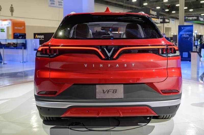 Ở đuôi xe, VinFast VF8 có thiết kế tương đồng với phía trước khi trang bị dải đèn hậu LED hình chữ V cách điệu bao bọc lấy logo thương hiệu, một chi tiết đặc trưng trên các dòng xe VinFast.