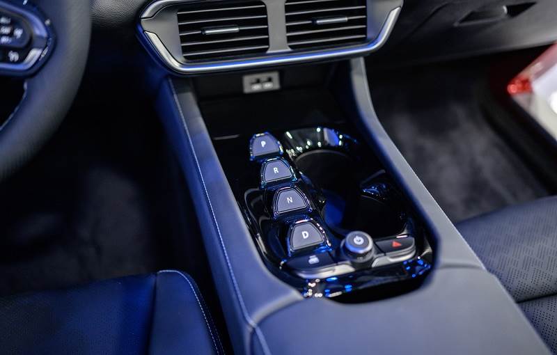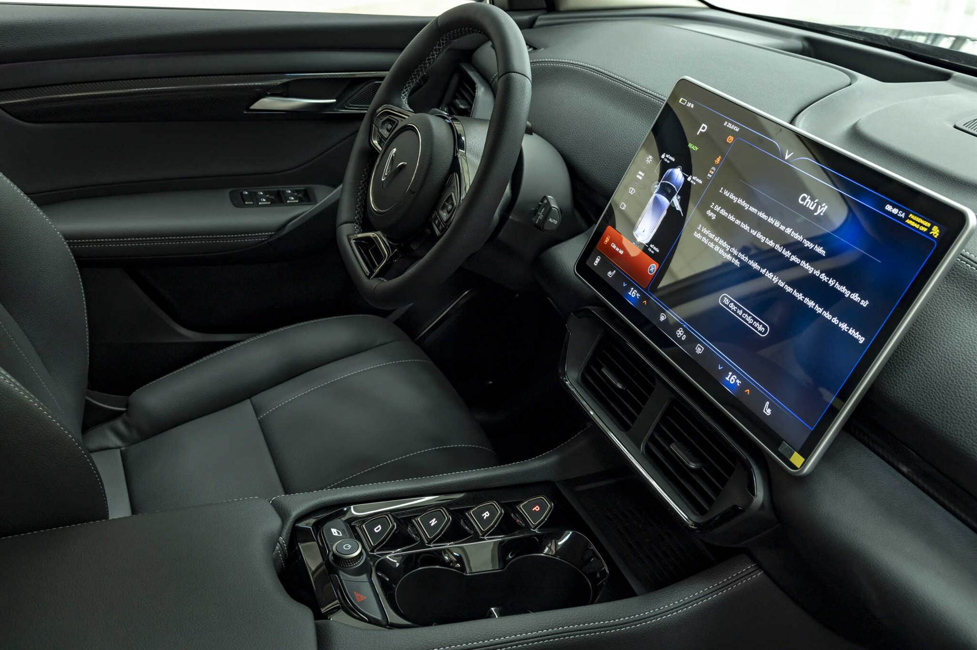 Đặc biệt, có thể nhận ra số lượng nút bấm vật lý trên cabin VF 8 nay đã được lược bớt, giúp người dùng dễ dàng theo dõi và điều khiển tính năng trong khi vận hành. Cần số điện tử có dạng nút riêng biệt được trang bị ở bệ tỳ tay trung tâm.