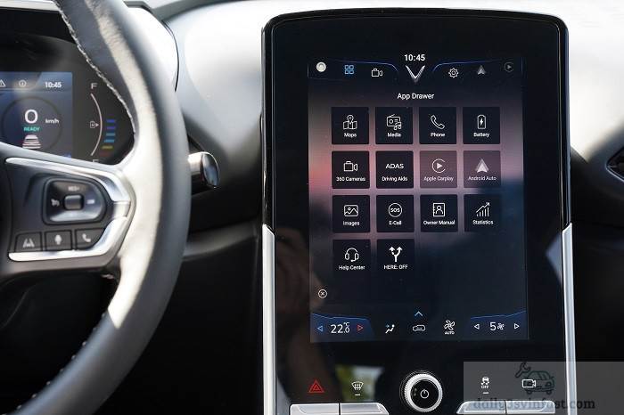 VinFast VF e34 được trang bị màn hình xe cảm ứng 10 inch. Ngoài hệ thống giải trí, màn hình còn cho phép người dùng cài đặt và theo dõi tất cả những tính năng điện tử trên xe.