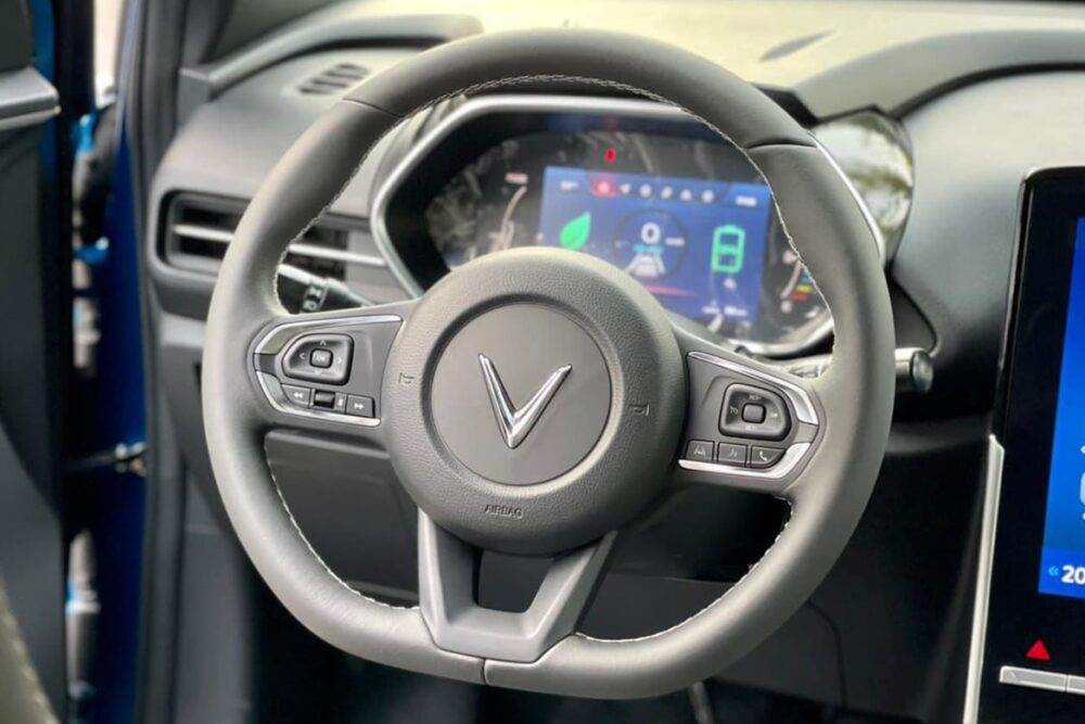 Vô lăng VinFast VF e34 với thiết kế 3 chấu D-cut bọc da, tích hợp đầy đủ các nút điều khiển chức năng. Cụm đồng hồ phía sau dạng đồng hồ kỹ thuật số hiển thị trên màn hình LCD 7 inch,